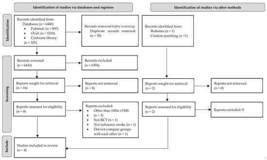 A total of 6440 studies were found in databases. A total of 30 records were excluded as duplicates, 6394 records were excluded based on their titles and abstracts, and 8 records were not retrieved. The remaining 16 studies were assessed for eligibility. A total of 3 studies were excluded because a frequency other than 10 Hz rTMS was used [17,18,19], one study was excluded because included patients experienced haemorrhagic and non-ischemic stroke [20], one study was not RCT [21], and one study did not compare rTMS and sham stimulation groups with each other [22]. Two articles were identified via other methods: one was found during citation searching [23] and one was found on a website [19]. In total, four trials were included in the systematic review [23,24,25,26]. To minimize the risk of bias, two authors independently reviewed the titles, abstracts, and full text articles.