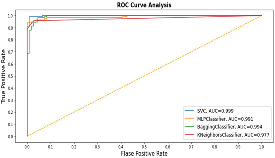 All the classifiers were implemented using default parameters provided in Table 3. Algorithms depend on the hyperparameter settings of the classifier to achieve optimal performance for the classification problem. We conducted grid search to tune the parameters to achieve the best performance for each classification algorithm (Table 4). Accuracy scores for all ML models reached a minimum of 93.8% (Table 5). The optimum-performance models were obtained using the SVM model with an accuracy of 98%. MLP and Bagging were referred to as the second- and third-best models, respectively.