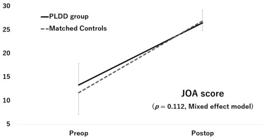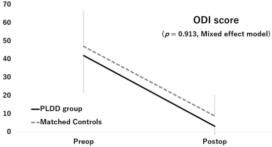 All patients were first classified into two groups based on their past history: a PLDD group and a control group. The average age, average preoperative clinical score, ratio of males to females, and BMI were compared between these two groups using the chi-squared test for categorical variables and the Mann–Whitney U test for continuous variables. Subsequently, matched control groups were created using propensity score matching. To estimate the propensity score, we fitted a logistic regression model using the patient’s age, sex, and BMI. The nearest-neighbor matching procedure was used, with the restriction that the matched propensities had to be within 0.001 units of each other. To identify the characteristics associated with the patients who underwent PLDD, preoperative data, preoperative radiographic findings, and surgical data were compared between the PLDD group and the matched control group using the Mann–Whitney U test or chi-squared test. When there was a significant difference in the chi-squared test, the residual analysis was performed as post-hoc analysis. The result of the residual analysis was considered to indicate p < 0.05 when all variables had |r| > 1.96, in accordance with the Haberman method []. To compare the postoperative changes in the JOA score and ODI between the PLDD group and the matched control group, a mixed-effect model was applied. All analyses were performed using SPSS software (version 23; SPSS, Chicago, IL, USA). A value of p < 0.05 was considered statistically significant.