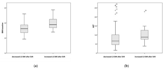 3.3. Comparison of Baseline Characteristics between Patients with Decreased L3-SMI and with Increased L3-SMI Assessed after Sustained Virological Response (SVR)