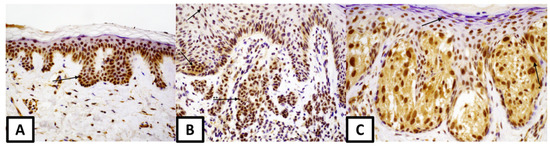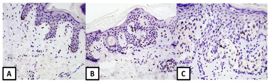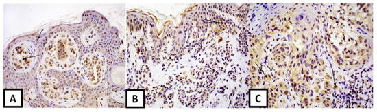 Nuclear expression of estrogen receptor α: (A) in melanocytic nevus (magnification 100×), arrow—melanocyte in the basal layer (B) in dysplastic nevus (magnification 100×), arrow—melanocyte (C) in melanoma (magnification 200×), arrows: melanocyte and * keratinocyte.