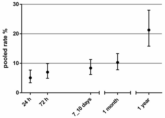 The proportion of patients with adverse events varied between 2% and 13% at 24 h; 4% and 14% at 72 h; 4% and 16% at 7–10 days; 7% and 17% at 1 month; and 14% and 30% at 1 year. The pooled rates of patients with adverse events ranged between 5.1% (95% CI 3.4% to 7.7%; I2 94%; 11,653 patients; and 8 studies) at 24 h and 21.3% (95% CI 15.8% to 28.0%; I2 94%; 2917 patients; and 5 studies) at 1 year. Table 2 reports the pooled rates of patients with adverse events at the different time frames. Figure 1 shows the pooled rates of patients with adverse events over time.
