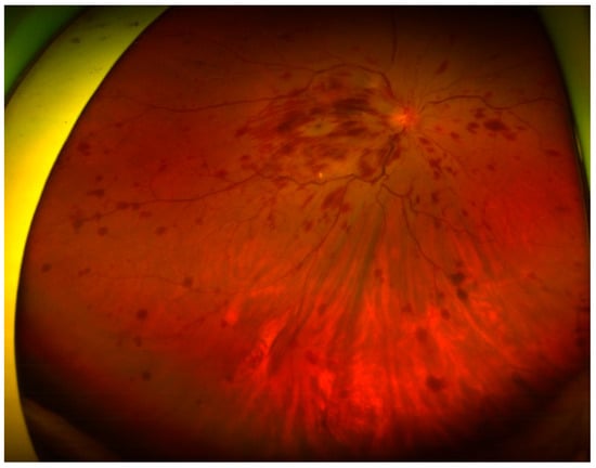 Funduscopic examination showing papilledema and flame-shaped hemorrhage over the four quadrants of the right eye.