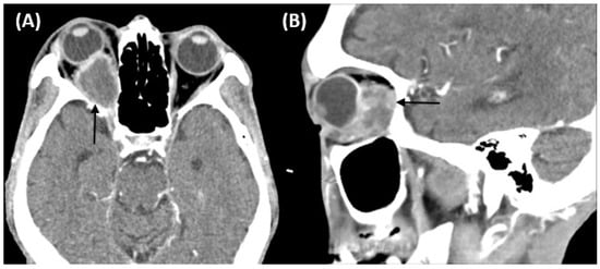 Computed tomography of the orbit demonstrating a soft tissue lesion measuring 3.3 × 2 × 2 cm in the right orbital fossa with peripheral enhancement (black arrow). The right globe and optic nerve are compressed, causing exophthalmos. (A) Axial image. (B) Sagittal image.