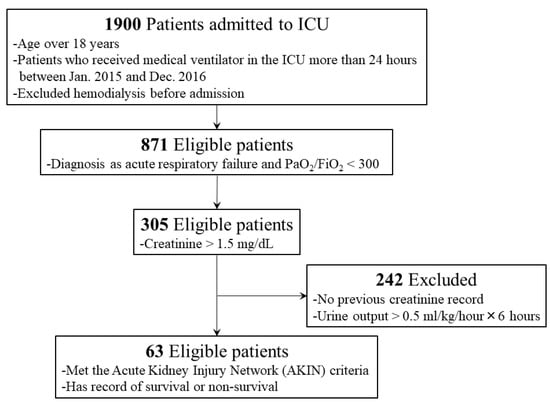 We retrospectively constructed a cohort study of patients who were admitted to the ICUs, including medical, surgical and neurological, over 24 months (January 2015 to December 2016) at Chiayi Chang Gung Memorial Hospital. Patients receiving chronic hemodialysis before admission and those hospitalized less than 24 h were excluded. We only considered adult patients (age ≥ 18 years) who met the criteria of the Acute Kidney Injury Network (AKIN) and were undergoing mechanical ventilator support due to acute respiratory failure on admission (Figure 1). The study was approved by the institutional review board of Chang Gung Memorial Hospital (IRB number: 201800112B0C501).