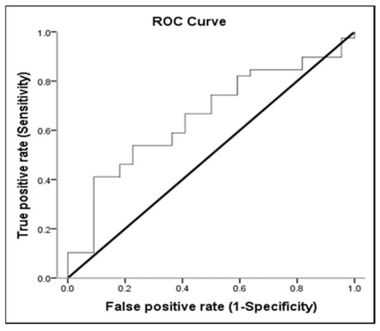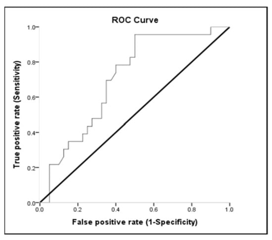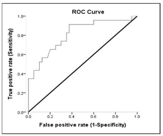 Lactate, MAP, and pH discriminated survivors from non-survivors. The area under the ROC curve of lactate was 0.654 (95% CI: 0.513–0.795; p < 0.05) for mortality (Table 3 and Figure 2). Sensitivity and specificity for overall deaths of lactate > 51.8 were 53.85% and 77.27%, respectively. The positive predictive value (PPV) and negative predictive value (NPV) of lactate for mortality were 80.77% and 48.57%, respectively (Table 4). The area under the ROC curve of MAP was 0.810 (95% CI: 0.694–0.926; p < 0.001) for overall mortality (Table 3 and Figure 3). Sensitivity and specificity for overall death of MAP ≤ 77.16 were 62.50% and 91.30%, respectively. The PPV and NPV values of MAP for mortality were 92.59% and 58.33%, respectively (Table 4). The area under the ROC curve of pH was 0.693 (95% CI: 0.560–0.826; p = 0.013) for overall mortality (Table 3 and Figure 4). Sensitivity and specificity for overall death of pH ≤ 7.22 were 47.50% and 95.65%, respectively. The PPV and NPV values of pH for mortality were 95.00% and 51.16%, respectively (Table 4). The area under the ROC curve of WBC was 0.612 (95% CI: 0.468–0.757; p = 0.147) for overall mortality; however, this result was not significant.