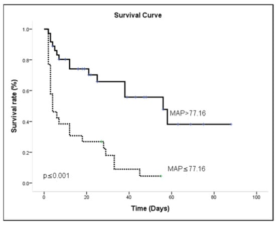 Sepsis is another factor classically associated with death in ICU patients. In the current study, sepsis occurred in 73% of the patients, similar to those previously reported by other investigators (64.4%) []. Recent data underline the strong prognostic impact of hypotension and cardiovascular failure in critically ill patients with sepsis []. Most patients with sepsis showed some degree of myocardial depression. Despite a compensatory increase in CO, the elevated SVR, hypovolemia, and myocardial depression induce hypotension, otherwise known as septic shock. Without aggressive fluid resuscitation in this phase, profound hypotension and progressive acidosis develop, leading to irreversible shock, multiple organ failure and death. The Surviving Sepsis Campaign Bundle states that vasopressin should be given to the patient to maintain a mean arterial pressure > 65 mmHg if the patient is hypotensive after fluid resuscitation, blood should be obtained for measuring lactate and blood cultures, and fluids and antibiotics should be administrated []. Nevertheless, increasing the MAP from 65 to 85 mmHg with nor-epinephrine neither affects metabolic variables nor improves renal function in septic shock [,]. A higher MAP (approximately 75 to 85 mmHg) may be preferable without harm in patients with chronic arterial hypertension, including patients with renal failure []. In the subgroup with acute or chronic renal failure, chronic hypertension is ubiquitous, and it has long been thought that renal disease decreases salt excretion, leading to volume overload and consequent hypertension []. In our study, the area under the ROC curve of MAP was 0.810 (95% CI: 0.694–0.926; p < 0.001) for overall mortality. Sensitivity and specificity for overall death of MAP ≤ 77.16 were 62.50% and 91.30%, respectively. This means that MAP > 77.16 mmHg is a good indicator to distinguish whether patients with renal failure combined with respiratory failure will survive. Therefore, in our study, MAP ≤ 77.16 mmHg was associated with higher probability of hospital death [OR = 3.06 (1.374–6.853); p = 0.006]; therefore, the blood pressure targets for renal failure in critical care should not be similar to that recommended for the general population.