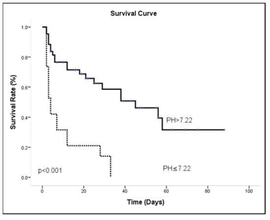 Most patients (73%) had suffered sepsis during their ICU admission, and the mean length of hospital stay was 24.32 ± 25.73 days. The survivors had significantly more cardiologic disease at admission then did non-survivors. In general, lactate > 51.8 mg/dL, MAP ≤ 77.16 mmHg and pH ≤ 7.22 were associated with mortality in univariate analysis. The risk of in-patient mortality during AKI combined with respiratory failure is shown in Table 5, reporting multivariable Cox regression survival model results. Adjusting for other covariates, patients with MAP ≤ 77.16 mmHg were associated with a higher probability of hospital death [OR = 3.06 (1.374–6.853); p = 0.006]. The other independent outcome predictor was pH ≤ 7.22 with a higher risk of hospital death [OR = 2.40 (1.122–5.147); p = 0.024]. Kaplan-Meier survival curves were calculated using the MAP ≤ 77.16 (Figure 5) and pH ≤ 7.22 (Figure 6). The results for the log-rank statistics were highly significant.