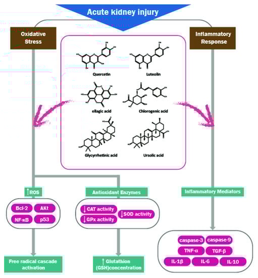 Many compounds, including flavonoids, polyphenols, terpenes, alkaloids, saponins, and quinones, have multiple beneficial pharmacological activities such as antioxidants and anti-inflammatories []. Oxidative stress is considered an AKI factor. Natural products derived from plants have strong anti-inflammatory and antioxidant properties. There have been many studies to investigating the effect of common herbal extracts and their constituents on AKI []. This section discusses extracts of several plants and isolated compounds used for the prevention and treatment of AKI.