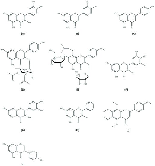 Flavonoids are found in many plant foods, including vegetables, fruits, and herbs. The flavonoid activity depends on the structure of the hydroxylated phenol []. Flavonoids are known to have anti-cancer, anti-inflammatory, and antioxidant effects [,,].