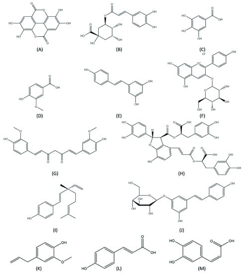 Chemical structures of polyphenols with potential preventive effects for aucte kidney injury. (A) Ellagic acid; (B) Chlorogenic acid; (C) Gallic acid; (D) Vanillic acid; (E) Resveratrol; (F) Anthocyanin; (G) Curcumin; (H) Salvianolic Acid B; (I) Bakuchiol; (J) Polydatin; (K) Eugenol; (L) p-Coumaric acid; (M) Caffeic acid.