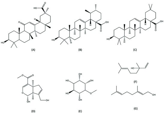 Chemical structures of terpenoids with potential preventive effects of aucte kidney injury. (A) Glycyrrhetinic acid; (B) Ursolic acid; (C) Oleanolic acid; (D) Genipin; (E) Pinitol; (F) Linalool; (G) Geraniol.