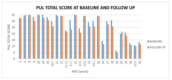 Showed PUL total score at baseline and at follow up according to age.