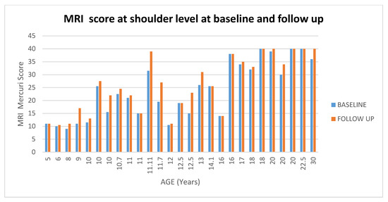 Showed scores in muscle MRI at shoulder level at baseline and at follow up according to the age.