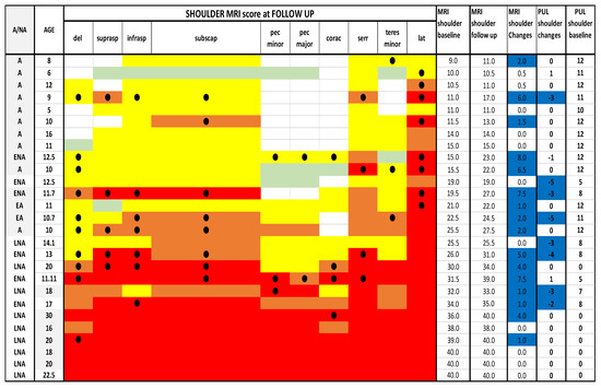 MRI and PUL scores at shoulder, arm and forearm level at baseline and at follow up. Individual details of imaging and PUL findings at shoulder, arm and forearm level. The shading reflects the severity of involvement with the score of 0 shown as a white cell, score of 1 as pale green, score of 2 as yellow, score of 3 as orange and score of 4 as red. Del = deltoid; suprasp = supraspinatus; infrasp = infraspinatus; subscap = subscapularis; pec = pectoralis; corac = coraco-brachialis; serr = serratus anterior; lat = latissimus dorsi; bic = biceps brachii; brac = brachialis; tri = triceps brachii; sup = supinator;pron = pronator teres; F cp = flexor carpi radialis; palm = palmar; F ds = flexor digitorum superficialis; F cu = flexor carpi ulnaris; Fdp = flexor digitorum profundus; Anc = anconeus; E cu = extensor carpi ulnaris; Edm = extensor digiti minimi; E d = extensor digitorum; E cr = extensor carpi radialis; Br R = brachioradialis; F pl = flexor pollicis longus; E pl = extensor pollicis longus. A = ambulant; EA = early ambulant; NA= non ambulant; ENA = early non ambulant; LNA: late non ambulant. ● Black circle means a higher Mercuri score respect to the baseline in the respective muscle. Blue line indicates changes in both MRI and PUL scores.