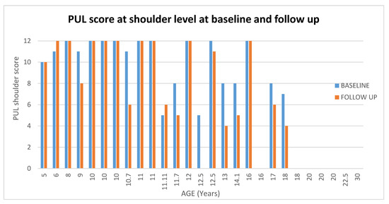 Showed scores in PUL at shoulder level at baseline and at follow up according to age.