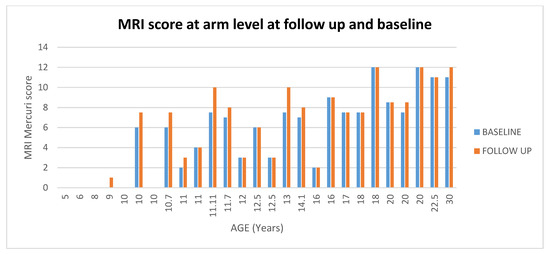 Showed scores in muscle MRI at arm level at baseline and at follow up according to age.