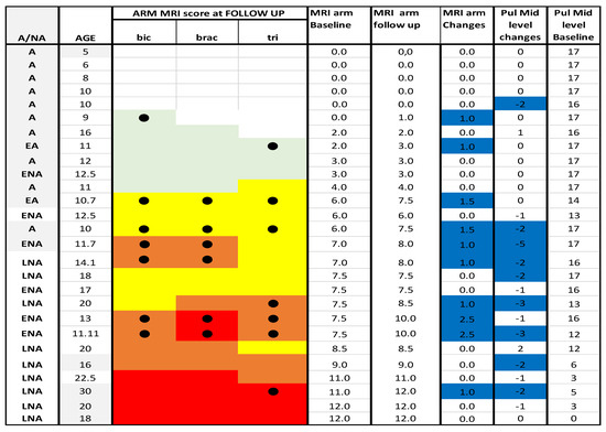 Detail of MRI and PUL at arm level. Individual details of imaging and PUL findings at arm level. The shading reflects the severity of involvement with the score of 0 shown as a white cell, score of 1 as pale green, score of 2 as yellow, score of 3 as orange and score of 4 as red. The grade 2.5 was used to identify patients with 2b involvement. Bic = biceps brachii; brac = brachialis;tri = triceps brachii; A = ambulant; EA = early ambulant; NA = non ambulant; ENA = early non ambulant; LNA: late non ambulant. ● Black circle means a higher Mercuri score respect to the baseline in the respective muscle. Blue line indicates changes in both MRI and PUL scores.