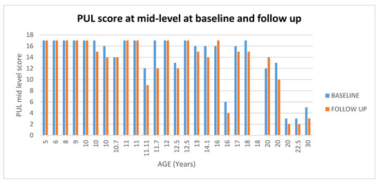 Showed scores in PUL at Mid-level at baseline and at follow up according to the age.