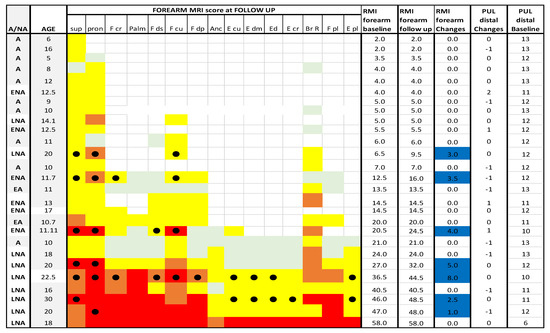 Detail of MRI and PUL at forearm level. Individual details of imaging and PUL findings at forearm level. The shading reflects the severity of involvement with the score of 0 shown as a white cell, score of 1 as pale green, score of 2 as yellow, score of 3 as orange and score of 4 as red. The grade 2.5 was used to identify patients with 2b involvement. Sup = supinator; pron = pronator teres; F cp = flexor carpi radialis; palm = palmar; F ds = flexor digitorum superficialis; F cu = flexor carpi ulnaris; Fdp = flexor digitorum profundus; Anc = anconeus; E cu = extensor carpi ulnaris; Edm = extensor digiti minimi; E d = extensor digitorum; E cr = extensor carpi radialis; Br R = brachioradialis; F pl = flexor pollicis longus; E pl = extensor pollicis longus. A = ambulant; EA = early ambulant; NA = non ambulant; ENA = early non ambulant; LNA: late non ambulant. ● Black circle means a higher Mercuri score respect to the baseline in the respective muscle. Blue line indicates changes in MRI scores.