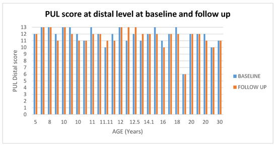 Showed scores in PUL at distal level at baseline and at follow up according to age.
