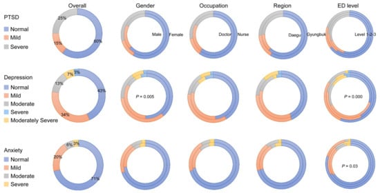 PTSD, depression and anxiety status of respondents. Values are presented as percentage (%). PTSD, post-traumatic stress disorder; ED, emergency department. PTSD: Korean version of the Primary Care Post-traumatic Stress Disorder Screen for the Diagnostic and Statistical Manual-5 (PC-PTSD-5), 0–1 = normal, 2= mild, 3–5 = severe. Depression: The Korean version of the Patient Health Questionnaire-9 (PHQ-9), 0–4 = normal, 5–9 = mild, 10–14 = moderate, 15–19 = moderately severe, 20–27 = severe. Anxiety: By the Korean version of generalized anxiety disorder-7 (GAD-7) scale, 0–4 = normal, 5–9 = mild, 10–14 = moderate, 15–21 = severe.