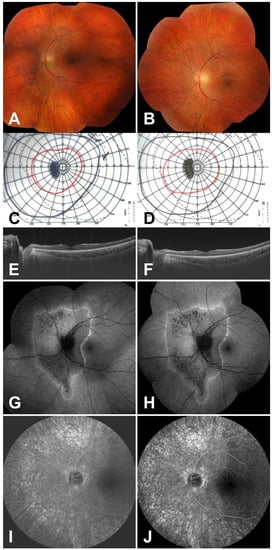 Changes in the affected eye on imaging tests on admission (A,C,E,G,I) and at five-year follow-up (B,D,F,H,J). Color fundus photography shows only an area of a thinner retina with some hyperpigmentation (A), as well as more pronounced hyperpigmentation and atrophic lesions after five years (B). Kinetic perimetry shows a slight enlargement of the blind spot (C,D). Swept-source optical coherence tomography reveals peripapillary disruption of the ellipsoid zone (E,F). Fundus autofluorescence shows an abnormal area encircled by a rim of high autofluorescence. The size of the spared perifoveal area remained stable on follow-up examinations (G,H). Fluorescein angiography (late phase) shows a peripapillary window defect of a similar extent comparing early and late phase (I,J).
