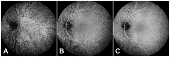 Indocyanine green angiography showing atrophy of the choriocapillaris in the affected area: early (A), middle (B), and late phases (C).