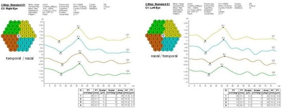 Electrophysiological examinations were performed using EP-1000 (Tomey, Japan). All examinations were compliant with the International Society for Clinical Electrophysiology of Vision standards [,,]. Pattern ERG (PERG), flash full-field ERG, and multifocal ERG were recorded with a silver thread (DTL) electrode. Retinal function in the right eye was normal. Flash full-field ERG findings in the left eye were comparable to those in the right eye. On pattern ERG of the left eye, a decreased amplitude of the P50 was observed, while the N95 amplitude was unaffected. On multifocal ERG, the lowering of the N1P1 amplitude was found in the nasal quadrants (Figure 3).