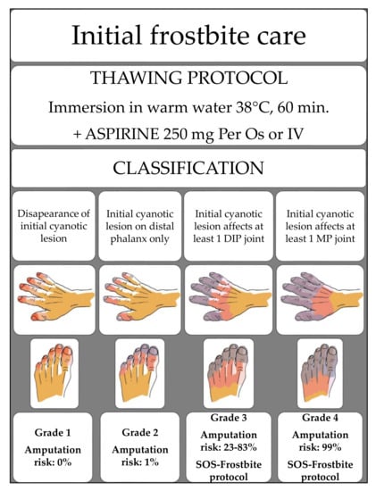 - Cauchy, E.; Davis, C.B.; Pasquier, M.; Meyer, E.F.; Hackett, P.H. A New Proposal for Management of Severe Frostbite in the Austere Environment. Wilderness Environ. Med. 2016, 27, 92–99. [Google Scholar] [CrossRef] [PubMed] [Green Version]