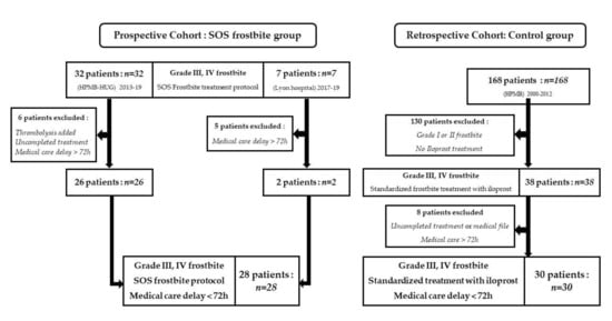 The retrospective cohort (control group): After reviewing all frostbite medical files in the Mont-Blanc hospitals (168 medical files), 30 patients met the inclusion criteria (standardized frostbite treatment with iloprost, grade 3 or 4 frostbite and medical care initiated within 72 h from frostbite injury) (
