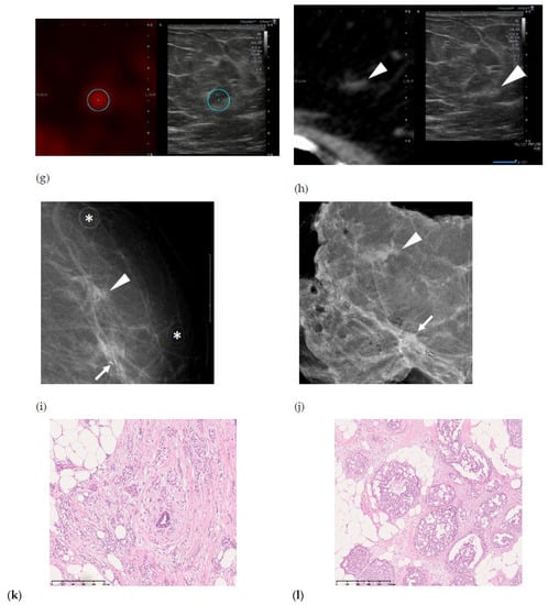 A woman in her 50s with two lesions of breast cancer in her left breast. (a) Mammography. Irregular mass (arrow) and grouped amorphous calcifications having a background density (arrowhead) are observed. (b) B-mode ultrasound (US). An irregular hypoechoic mass consistent with a mammography mass. Biopsy revealed ductal carcinoma. (c) Maximum intensity projection of contrast-enhanced magnetic resonance image (MRI) showing a 6-mm oval mass at 4 o’clock in her left breast (arrow) and a 9-mm linear enhancement at 2 o’clock in her left breast (arrowhead). The nipple is circled. (d) 18F-fluorodeoxyglucose positron emission tomography/computed tomography (18F-FDG PET/CT) fusion axial image. The mass has a breast marker nearby. The maximum standardized uptake value (SUVmax) was 1.4. (e) 18F-FDG PET/CT fusion axial image. Another 2 o’clock lesion is also found on PET/CT with an SUVmax of 1.0. (f) Virtual navigator real-time US fusion imaging with CT. The metallic breast marker is set as a reference (circle). (g) Virtual navigator real-time US fusion imaging with 18F-FDG PET/CT. The lesion candidate is shown on US corresponding to the accumulation of 18F-FDG PET/CT (circle). (h) Virtual navigator real-time US fusion imaging with CT. The lesion candidate shows a small amount of isolated mammary gland tissue on both US and CT (arrowheads). (i) Mammography for confirmation after marking. Two ring markers were placed on the skin surface (*). A metallic breast marker is shown near the irregular mass (arrow). (j) Mammography of the surgical specimen showing that two lesions had been resected (arrow and arrowhead). (k) Surgical specimen, hematoxylin and eosin staining. The lesion corresponding to the mass was a 10-mm invasive ductal carcinoma showing a cordlike and vesicular growth pattern. (l) Surgical specimen, hematoxylin and eosin staining. The lesion corresponding to calcification was a 6-mm invasive ductal carcinoma showing a cribriform growth pattern. Arrows, breast cancer that appeared as a mass; arrowheads, breast cancer that appeared as calcification and could be detected by MRI and 18F-FDG PET/CT.