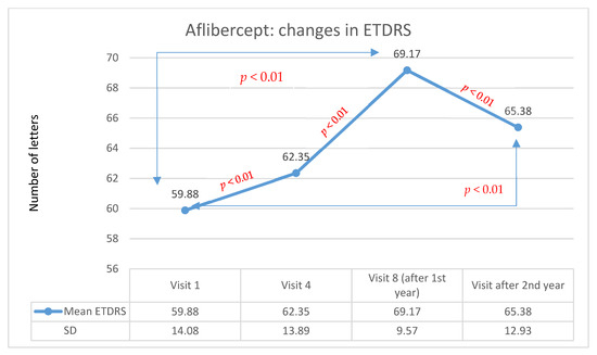 In group A, after the second year of therapy, visual acuity improved in 47.0% of patients (42 persons) compared with baseline values before therapy started. Stabilization occurred in 24.0% of patients (22 persons), and deterioration occurred in 27% of patients (24 persons). After the second year of treatment, the average visual acuity was 65.4 letters. The average improvement was 5.5 letters (statistically significant in the Wilcoxon test: Z = −7.96; p < 0,01). Changes in visual acuity for patients being treated with Aflibercept in the two-year follow-up are shown in Figure 1. In group B, after the second year of therapy, visual acuity improved in 40.6% of patients (22 patients) compared with baseline values before therapy. Stabilization occurred in 44.4% of patients (24 patients), and deterioration occurred in 15% of patients (8 patients). After the second year of treatment, the average visual acuity was 64.4 letters.