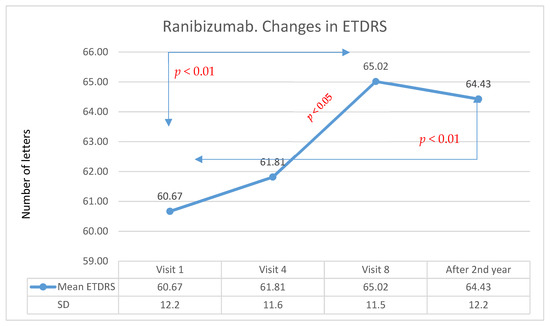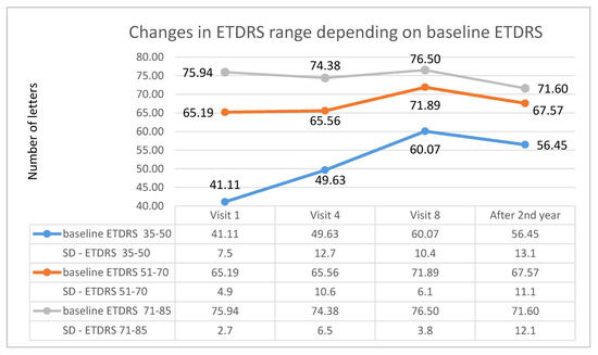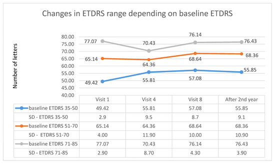 In addition, appropriate subgroups were created in each studied group (A and B) depending on the initial ETDRS visual acuity (first subgroup: 35–50 letters; second subgroup: 51–70 letters; third subgroup: 71–85 letters). For patients receiving Aflibercept, the first subgroup included 27 patients, the second subgroup included 47 patients, and the third subgroup included 16 patients. In patients treated with Ranibizumab, there were, respectively, 26, 14, and 14 patients. For both therapies, the highest increase in ETDRS letters took place in the first subgroup, i.e., in patients with the lowest initial visual acuity; however, for patients treated with, Aflibercept, this occurred at the 8th control visit (after one year of therapy), whereas for Ranibizumab, visual acuity improvement was lower and was noted at the 4th control visit (after third injection). The therapeutic effect in this subgroup was more stable for Ranibizumab after 2 years of therapy. The visual acuity curve in patients belonging to the intermediate subgroup was similar to that of the first subgroup. In the subgroup with the best initial visual acuity, this parameter decreased after the second year of therapy for both drugs (these dependencies are shown in the Figure 5 for Aflibercept and Figure 6 for Ranibizumab).