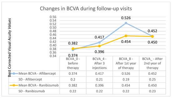 Changes in the best corrected visual acuity during individual follow-up visits—comparison of Aflibercept and Ranibizumab treatment results. The course of the best corrected visual acuity curve is much flatter for the group receiving Ranibizumab.