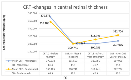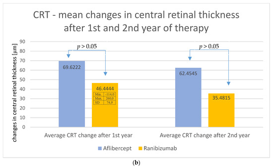 (a) Changes in the central retinal thickness during individual follow-up visits—comparison of treatment results for Aflibercept and Ranibizumab. The obtained decreases in retinal thickness did not differ significantly statistically between the two groups, (p > 0.05). (b) Average change in central retinal thickness after the first and second years of treatment—comparison of treatment results for Aflibercept and Ranibizumab. No significant statistical differences (p > 0.05) were observed.