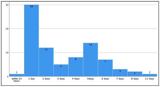 Comparison of clinical parameters in patients with respect to PPI timing (48 h vs. later): 43 of 83 patients (51.8%) underwent early PPI (within 48 h). Within this group, the implantation of a permanent pacemaker was performed on the day of TAVR implantation in one patient and on the first or second postinterventional day in 30 vs. 12 patients, respectively. Late PPI took place in 40 patients up to 11 days post-intervention (early PPI 1.3 ± 0.45 days vs. late PPI 5.2 ± 1.6 days, p = 0.0). (Figure 1, Table 3).