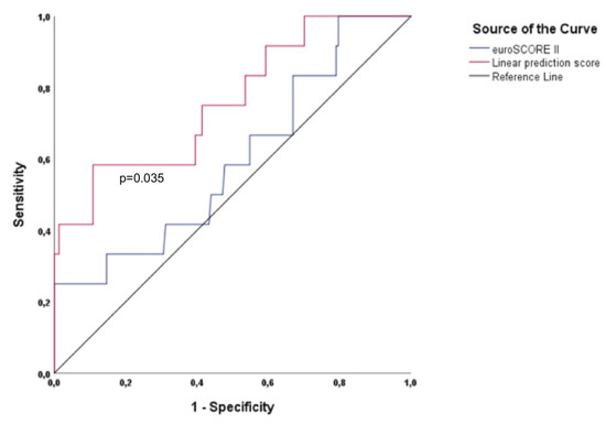 where Xi is the independent predictor and Bi is the regression coefficient of this predictor as calculated in multivariate regression analysis. Receiver operating characteristic (ROC) curve analysis was also performed, where appropriate. Society for Thoracic Surgery (STS) scores were not included in the analysis, due to restrictions placed by the multivariate analysis and the non-availability of its formula. The data were presented as number (percentage) or median (interquartile range, IQR). The differences were considered significant by error probability p < 0.05. All statistical analyses were performed by a senior professional statistician (A.B.) using SPSS-26 software (IBM, Armonk, NY, USA).