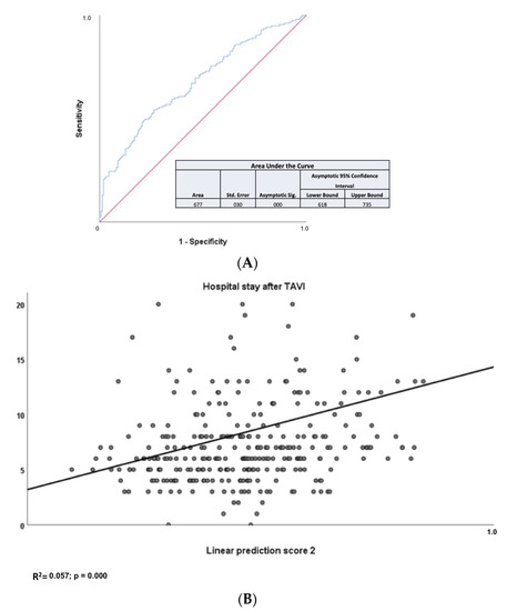 (A) Area under the ROC curve for the calculated LPS 2 for the secondary endpoint LoS. The calculated linear prediction score (LPS) 2 provided an area under the ROC curve of 0.667 (p < 0.001; 95% confidence interval 0.618–0.735). (B) Values for the secondary endpoint LoS as a function of LPS 2. Calculation of linear prediction score (LPS) 2 based on baseline levels of eGFR based on cystatin C and NTproBNP and EQ5D5L score allowed evaluation of LoS (R2 = 0.057; p < 0.001).
