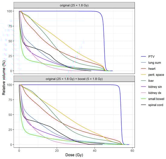 The treatment plans were then analyzed according to dose–volume histograms (DVHs) data. Following DVH parameters were evaluated, and the differences were set between a primary plan (D 45 Gy) and the virtual plan with an additional boost of 9.0 Gy (D 54 Gy): the mean lung, heart, and liver doses, median left and right kidney doses, the volume of the isodose of 25 Gy (V