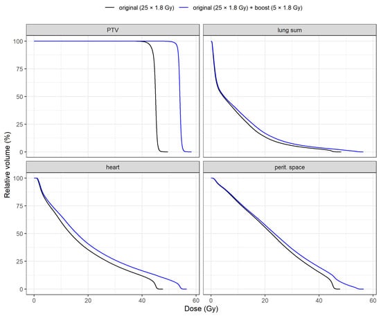 Primary plans with the prescribed dose of 45 Gy/25 fractions were compared with particular summary plans consisting of primary plans of 45 Gy/25 fractions with the additional virtual boost of 9.0 Gy in 5 fractions. Differences for each defined parameter were determined between particular fractionation schemes. The DVH parameters and the differences were described using standard summary statistics, i.e., median and range. Moreover, mean DVH was estimated for PTV and specific OAR. The coverage of individual PTVs by 95% isodose in primary and boost plans was expressed by the value of the Van’t Riet conformity index (CI), with the most optimal value being equal to 1, which means a practically unachievable situation when the 95% isodose exactly fits the defined PTVs. To compare the NTCP values between groups, a two-tailed paired Wilcoxon test was used with a common significance level of 0.05. All statistical analyses were performed employing R version 4.0.3.
