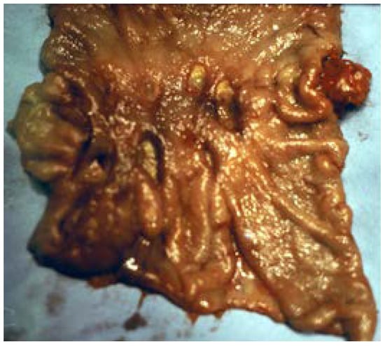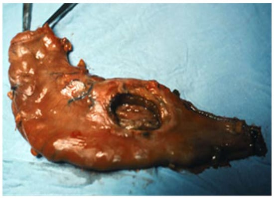 In general, there are three categories of ulcers that can be present based on the multiplicity of lesions: Cruveilhier chronic ulcers, acute ulcers, and lymphomatous ulcers. [9,10]. We had one patient with gastrointestinal haemorrhage, operated in an emergency, with over 100 typical diffuse ulcer lesions on the entire gastric surface, between 1–2 cm lesions and 3 cm ulcer craters, with the latter involving the fornix in a close subcardial position. A quasi-total gastrectomy was required for haemostasis (Figure 5). To our surprise, all of this patient’s ulcers, histologically, were Cruveilhier chronic ulcers. Another particular aspect, in this case, was the absence of gastric mucus, confirmed by PAS staining. Multiple ulcers can be detected after immunosuppressant therapies [10] and within the evolution of lymphocytic gastritis, characterized by the excessive lymphocytes infiltrate in the gastric mucosa and submucosa [15,16,17].