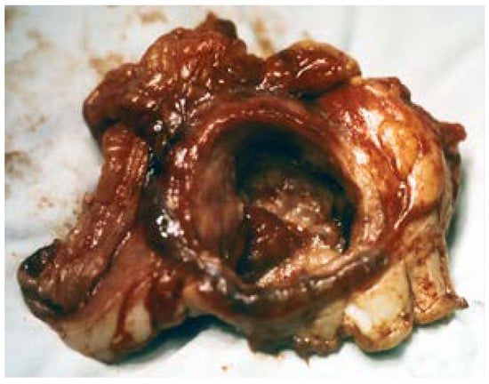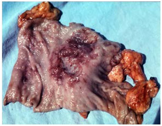 Multiple ulcers might also develop in the evolution of neoplastic conditions such as gastric lymphoma, having a separate share within ulcer pathology. Stomach damage may appear in combination with a large variety of gastrointestinal lymphomas, with or without lymph node involvement. Our area of interest only covers primitive gastric lymphomas, most of which are non-Hodgkin’s with a B lymphocyte substrate. However, ulcer lesions might also be found in association with MALT lymphomas. A lymphoma might be a primitive gastric lymphoma, manifesting as an ulcer lesion [19]. Lymphomatous ulcers, but thankfully do not involve ulcers over 2–3 cm and perforations or significant bleeding. Their depth is shallow, and they are superficially and frequently arranged in clusters in one gastric area (Figure 6, Figure 7 and Figure 8). Their macroscopic appearance is dish-like, with pseudo-diphtheroid white deposits. Ulcerating lymphomas surgery involves gastric resection with lymph node resection, adapted to lesion location, from D1 to D3/D4 [19]. This surgical technique obeys the principles of lymph node surgery [18,22,23]. Gastric ulcers are versatile and polymorphic that they might pose serious technical difficulties. It is often impossible for the surgeon to reach a diagnosis based on the extemporaneous histology and pathology investigation of a biopsy specimen. In the absence of this technique, the bleeding ulcer lesion must be removed without the decisive support of histology and pathology diagnosis.