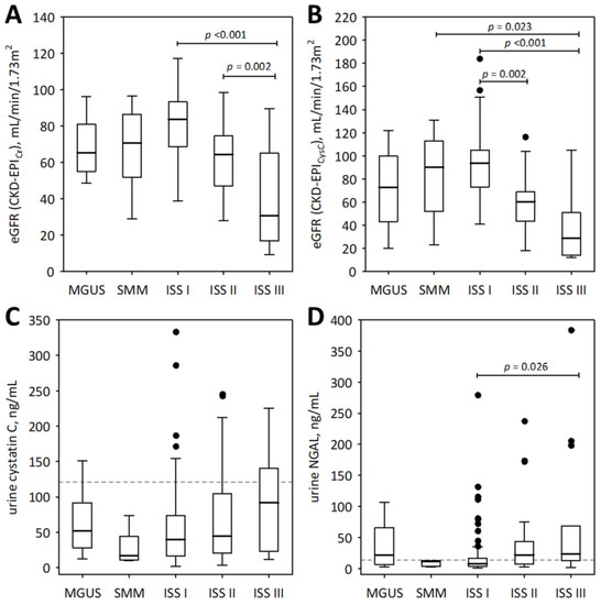 The values of eGFR based on serum creatinine (A) and cystatin C (B), and urinary concentrations of cystatin C (C) and NGAL monomer (D) among patients with monoclonal gammopathy ranging from MGUS to symptomatic MM. Data are shown as the median (central line), interquartile range (box), and non-outlier range (whiskers). The outliers are shown as points. We report p-values for significant differences between groups (calculated in post-hoc tests following the Friedman ANOVA). The dotted lines in panels (C,D) indicate non-outlier maximum urinary concentrations of the markers obtained in the control group of 21 healthy individuals.
