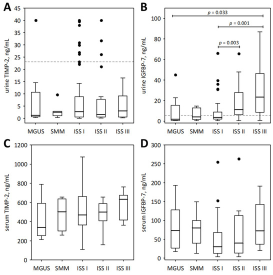 Urinary (A,B) and serum (C,D) concentrations of TIMP-2 (A,C) and IGFBP-7 (B,D) among patients with monoclonal gammopathy ranging from MGUS to symptomatic MM. Serum concentrations of the markers were assessed in a subgroup of 73 patients. Data are shown as the median (central line), interquartile range (box), and non-outlier range (whiskers). The outliers are shown as points. We report p-values for significant differences between groups (calculated in post-hoc tests following the Friedman ANOVA). The dotted lines in panels (A,B) indicate non-outlier maximum urinary concentrations of the markers obtained in the control group of 21 healthy individuals.