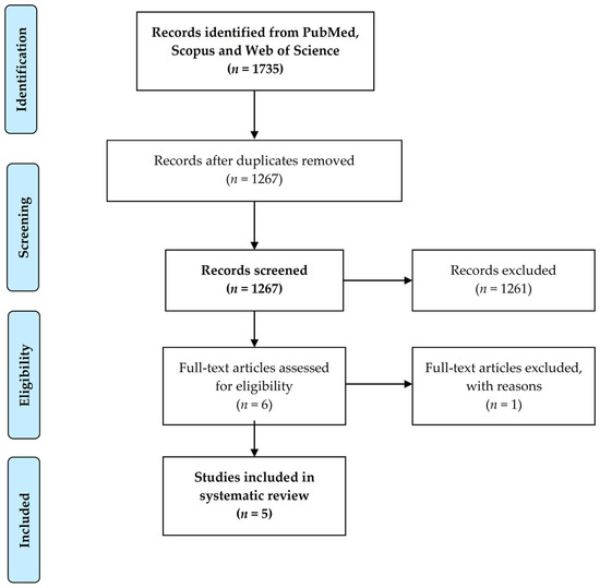 Figure 1 shows the PRISMA flow diagram. The literature search revealed a total of 1735 articles, of which only 6 were considered eligible for inclusion. Of these, one article was excluded after thorough examination, as it did not meet the inclusion criteria [28]. Thus, a total of five articles were included in the analysis [29,30,31,32,33]. The publication year of these studies ranged from 2017 to 2021. Three articles used a mixed quantitative/qualitative design [31,32,33] and two were quantitative in nature [29,30].