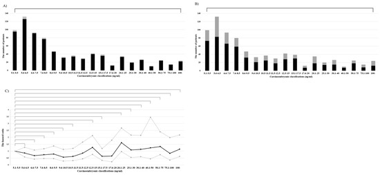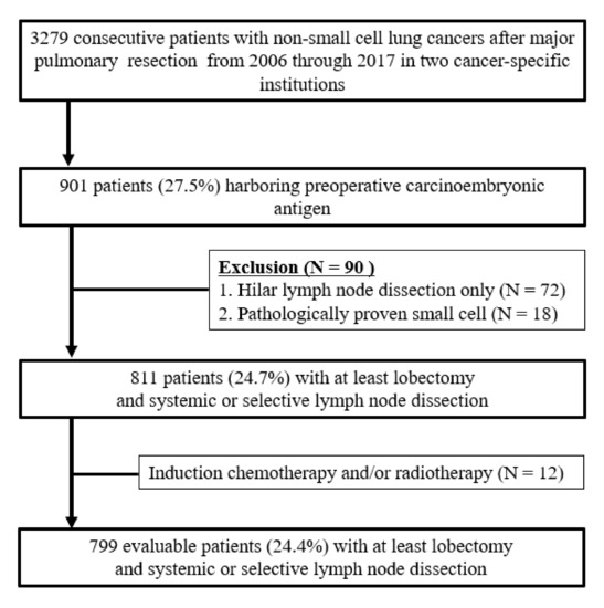 This retrospective study was approved by the institutional review board of Aichi Cancer Center Hospital (2020-1-613), and the study protocol was performed in adherence with the Declaration of Helsinki. The requirement of informed patient consent was waived because of the retrospective nature of this study. Between January 2006 and December 2017, 3279 consecutive NSCLC patients underwent lobectomy or more with systemic lymph node dissection at two cancer-specific institutions. Among them, 901 patients (27.5%) were pointed out abnormal serum levels of CEA, preoperatively. The following exclusion criteria were applied: (1) patients with hilar lymph node dissection alone, (2) patients with a final diagnosis of small cell lung cancer, (3) patients who were receiving induction chemotherapy with or without radiotherapy, and (4) patients who had undergone sublobar resection. Finally, as shown in Figure 1, 799 patients (24.4%) were eligible for this cohort.