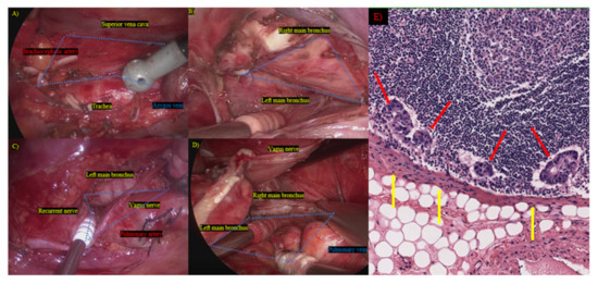 The study cohort included 799 patients (485 (60.7%]) men and 314 (39.3%) women) with NSCLCs and CEA abnormality (median: 8.5; interquartile range (IQR): 6.2–15.5). The patient flow algorithm is illustrated in Figure 1. Patient characteristics before and after propensity adjustment are summarized in Table 1 and Table 2, respectively. The range of mediastinal lymph node dissection in the two cancer-specific institutions, including en bloc lymph node dissection with the exposure of remnant surrounding structures, is depicted in Figure 1. This method was useful and feasible because cancer can metastasize through the sheath of a lymph node (Figure 2E).