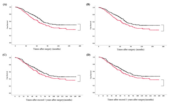 All the computations were performed using standard software (SPSS version 25.0; SPSS Inc., Chicago, IL, USA). The comparisons between the two groups were performed using the Mann–Whitney U-tests. Baseline variables that were considered clinically relevant or that revealed a significant difference in univariate analysis were entered into the multivariate model. Propensity adjustment was defined as conditional probability calculated using preoperative covariates. The Kaplan–Meier method was used to analyze survival rates in patient subsets; between-group differences in survival were assessed using the log-rank test. Potential correlates of survival were subjected to univariate and multivariate analyses using the Cox proportional hazards regression model. Hazard ratios (HRs) and median survival rates are presented as 95% confidence intervals (CIs). Statistical significance was set at p < 0.05.