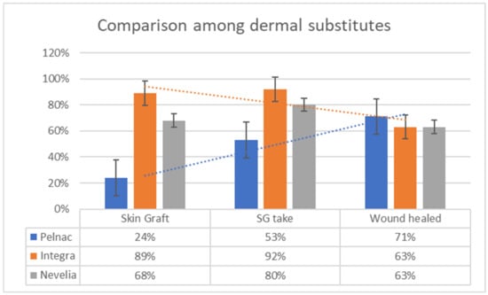 18], clinical superiority has not been established. Our retrospective large-cohort study aims to evaluate two different outcomes that, in our opinion, best reflect the definitive efficacy of DSs: the wound surface reduction (calculated after 30 days from the removal of the external layer) and the skin graft take (evaluated after seven days from the silicon sheet removal). This is the first multi-comparative in vivo study between different DSs and the undoubtedly largest present in literature.